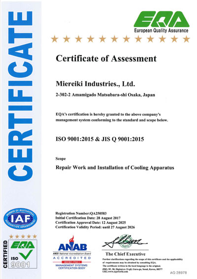 三重冷機工業株式会社は、2017年8月に品質マネジメントシステムの認証を取得いたしました。弊社では今後ともチラーの設置、及びメンテナンス業務において徹底した品質管理を行い、更なる品質向上を目指してお客様にご満足いただけるサービスを提供し、社会に貢献してまいります。